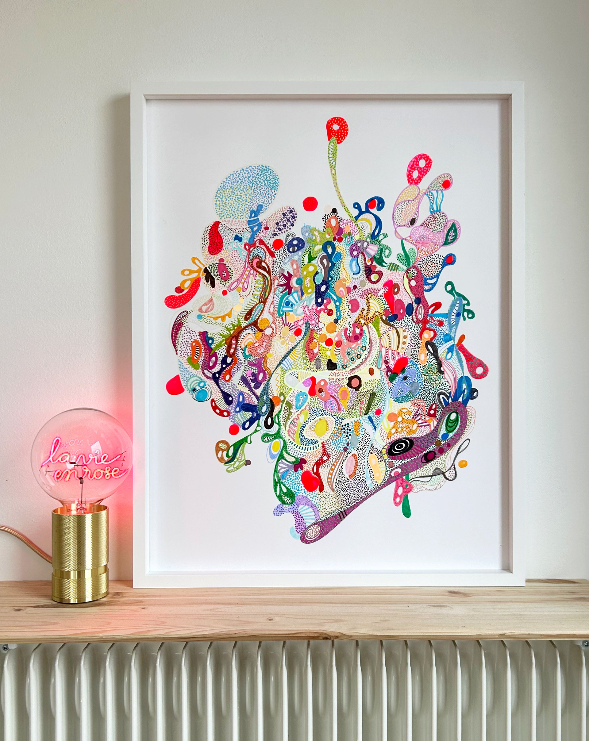 Cadre 3D en Tilleul blanc avec verre. Le cadre éloigne l'œuvre du verre, permettant un effet de profondeur très artistique.